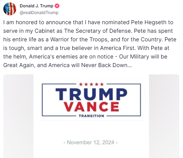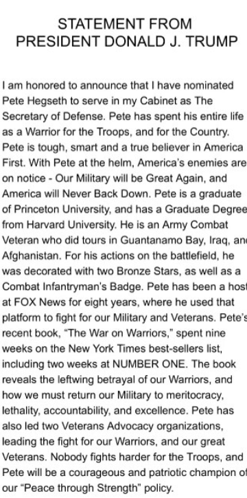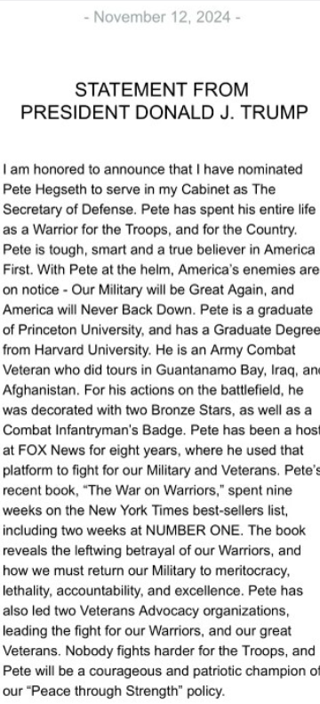 Oh, my goodness…what a surprise nomination by President Trump. I hope Hegseth brings MOH recipient David Bellavia in as one of his advisors and a bunch of other combat warriors.
