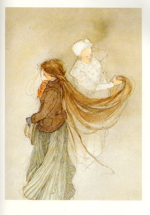 On went her old brown jacket; on went her old brown hat. With a whirl of skirts and with the brilliant sparkle still in her eyes, she fluttered out the door and down the stairs to the street.