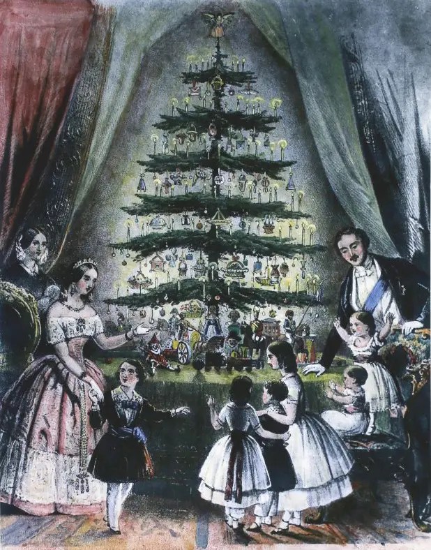 But the image of a decorated Christmas tree with presents underneath has a very specific origin: an engraving of Queen Victoria and Prince Albert and their children gathering around a Christmas tree, eyeing the presents underneath, published in the Illustrated London News in 1848. The premier women’s magazine in America back then, Godey’s Lady’s Book, reprinted a version of the image a couple of years later as “The Christmas Tree.”