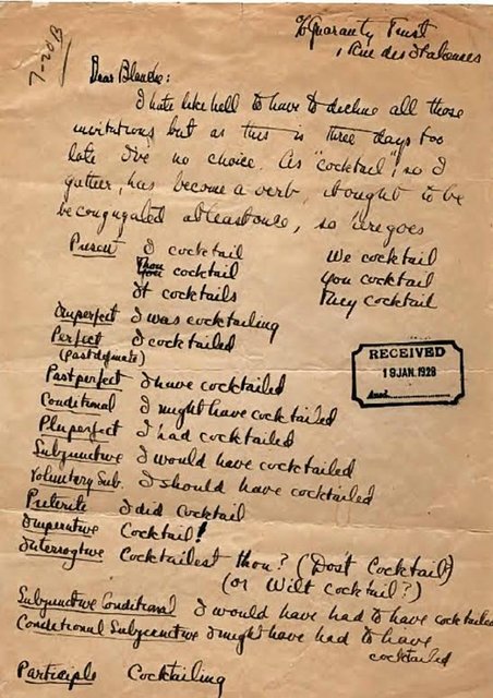 10. F. Scott Fitzgerald conjugates “to Cocktail,” the Ultimate Jazz-Age Verb, in a 1928 letter to Blanche Knopf.