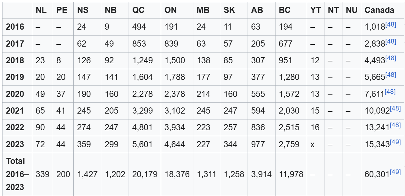 There have been 60,301 MAID deaths reported in Canada since the introduction of legislation in 2016. In 2023, 15,343 MAID provisions were reported in Canada, accounting for 4.7% of all deaths in Canada. This represents a growth rate of 15.8% over 2022.