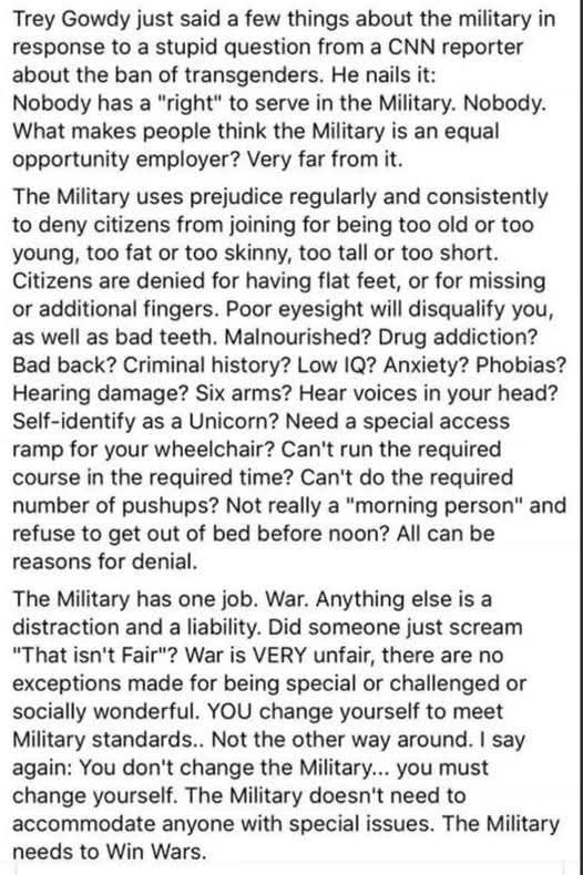 Transgenders have a need for a lot of medical care, I understand. They have no business in the military. That doesn’t even address the fact that it is a mental/emotional problem.