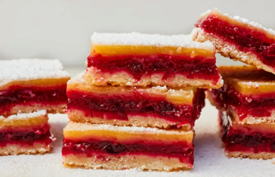 As you can see, they are a 3-layer bar: sweet short crust, cranberry jam, lemon curd. They are sweet, but with a nice lemony bite. I chose not to top mine with powdered sugar, but that is an option. Here is how they are made.
