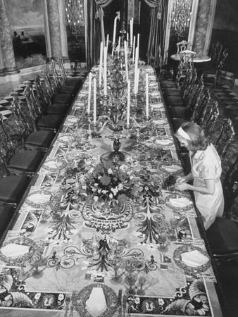 Good day, Menagerie! Mrs. Marjorie Merriweather Post sure spent her riches on the estate. Seems to me that she coughed up a million on a carved dining room table when a million dollars was huge. This is likely a photo of it with a table cloth on its precious wood. I wonder if it was sold with Mar-a-Lago at the time Donald Trump bought the property….