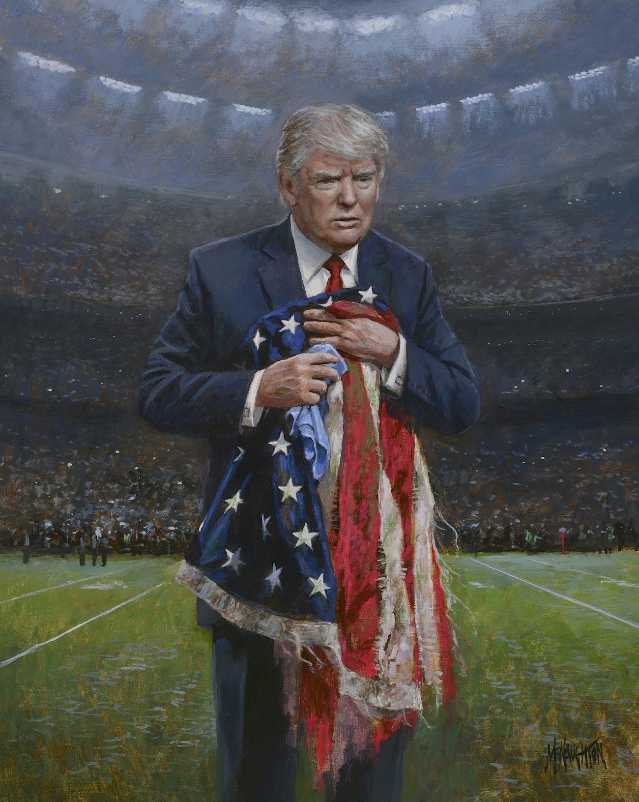I painted President Trump picking up a shredded and trampled flag off the football field. He holds a wet cloth in his right hand, as he attempts to clean it.
