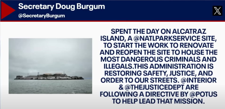 U.S. Attorney General Pam Bondi and Interior Secretary Doug Burgum toured Alcatraz Island Thursday. At the direction of President Donald Trump, the infamous former prison in San Francisco could be brought back into use as a high-security federal detention center.