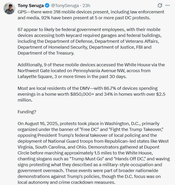 GPS—there were 318 mobile devices present, including law enforcement and media. 92% have been present at 5 or more past DC protests.
