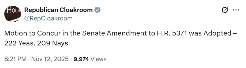Six Democrats voted in favor of the continuing resolution, and two Republicans voted no.