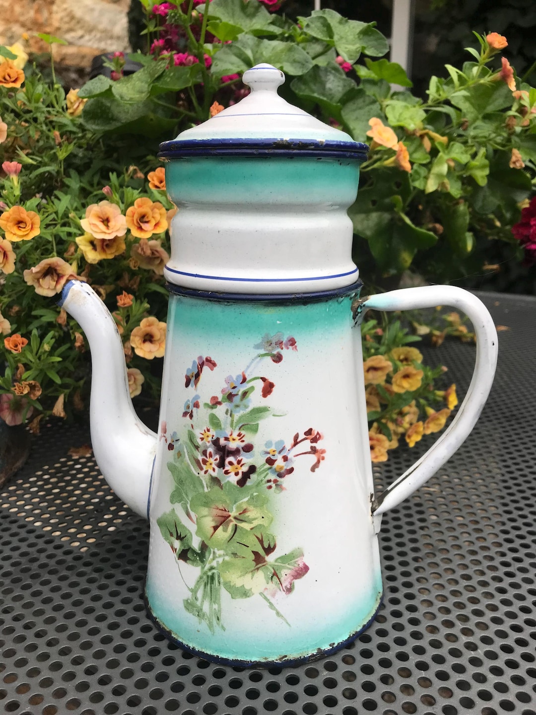 Good mornin’, and happy Wednesday! Sure am glad that I wasn’t a “d” last night. That was a thumpin’ that POTUS put on them for all to see. Now, keep the pressure on them for the next nine months. This is described as a Vintage French enamel pot. Keep your head on a swivel and carpe’ your coffee.