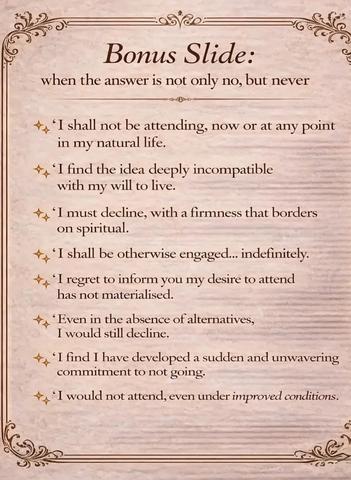 Happy Wednesday everyone. Victorian phrases to decline an invitation. I’m going to mix things up, instead of just saying nope, I don’t want to.