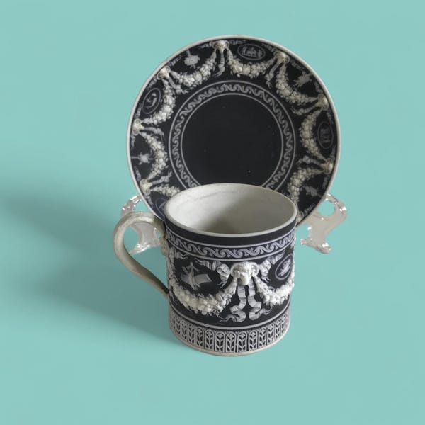 No matchy match mugs were found for your lovely black Wedgwood coffee pot. However, this cup and saucer would still look fine on your sideboard….