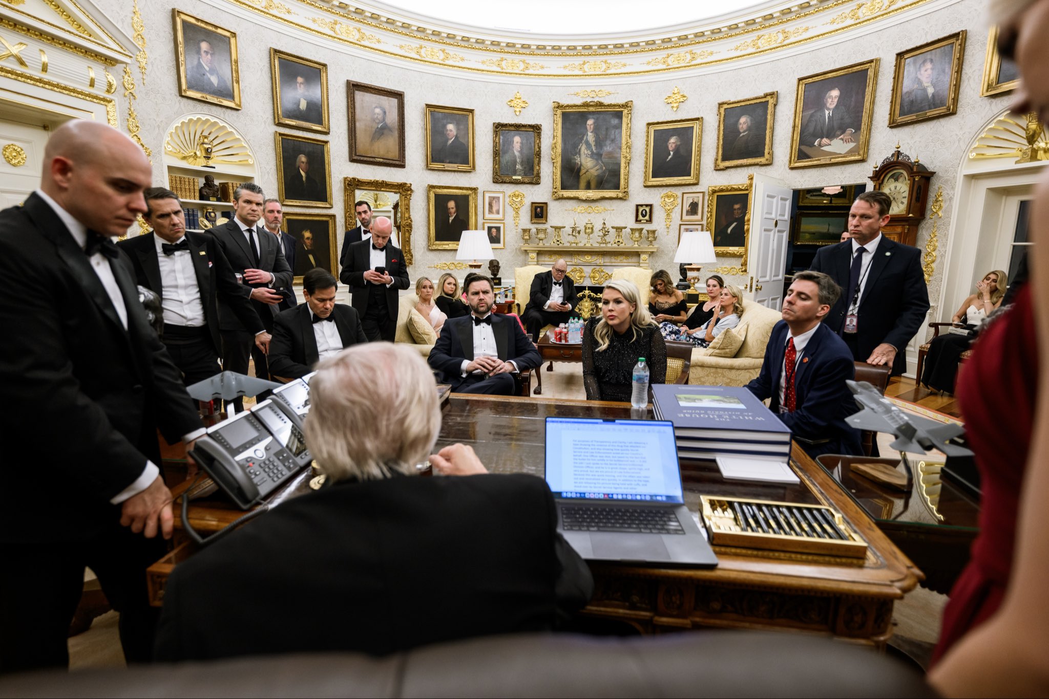 “The President and Cabinet members watch the CCTV footage of the White House Correspondents’ Dinner from the Oval Office at 10:15pm, April 25, 2026.” (White House photo by Daniel Torok)