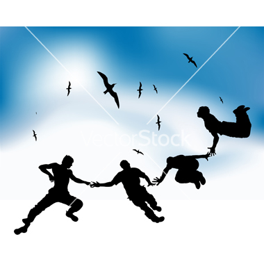 Happy friends fly in sky, black silhouettes