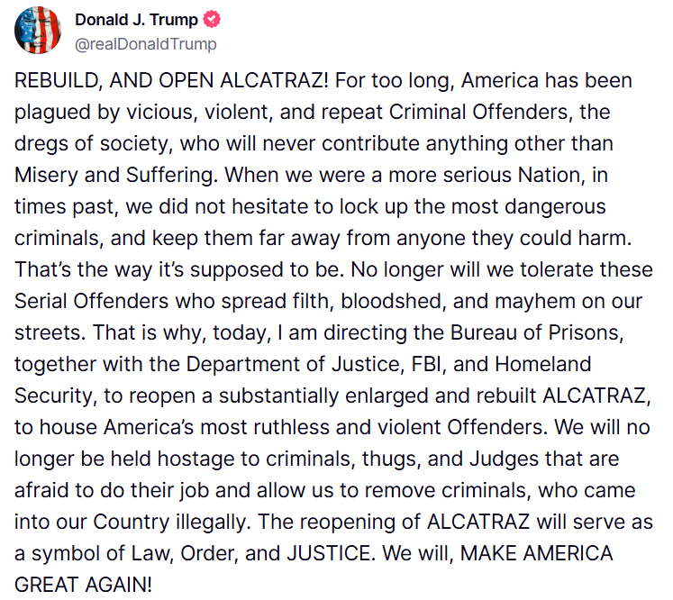 As WeeWeed pointed out this morning, President Trump has ordered the reopening of Alcatraz: